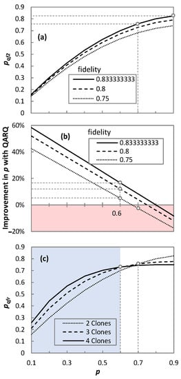 Let us now perform a quantitative analysis of QARQ by comparing the probability of successful transmission with QARQ (pqfr) and without QARQ (p) (Figure 7). The impact of fidelity degradation in the protocol due to various sources of decoherences is considered.