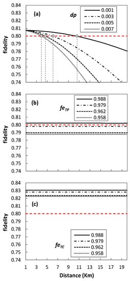 Let us first study the fidelity of the three quantum technologies applied to QP2MP (Figure 8). We assume a fidelity threshold equal to 0.8, as in QKD [], represented by red line in Figure 8.