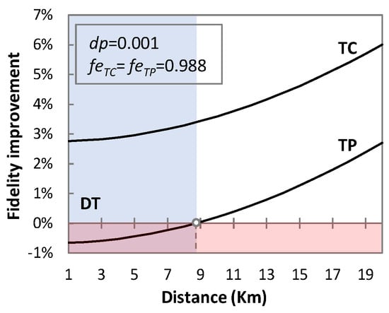 TP and TC protocols tend to have no significant effect on fidelity in terms of the transmission distance, but they provide a major degradation of fidelity if entanglement is not perfect. For example, from feTP = 0.988 to 0.979 (Figure 8b) and at 1 km, the fidelity of the teleported qubit drops from 0.802 to 0.798. Similarly, for the telecloned qubit from feTC = 0.988 to 0.979 (Figure 8c) at 1 km, the fidelity drops from 0.830 to 0.828. This could suggest that if entanglement is not perfect, then DT may provide better results for short distances than TP or TC. To illustrate this better, Figure 9 represents the improvement in fidelity by using TP and TC over DT. For feTP = feTC = 0.988 and dp = 0.001, DT outperforms TP for a distance of up to 9 km. However, TC performs better than DT and TP for the same case scenario, and improvement increases with transmission distance. In particular, the improvement in the fidelity of TC is around 3.5% with respect to TP, which increases to 3.77% for feTP = feTC = 0.979.