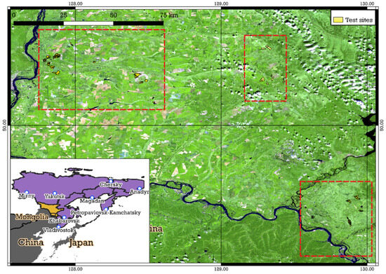 Study area 2 (Amur Region). Red boxes means spatial areas with sites.