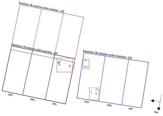 Sentinel-1 tracks for SA2. Red boxes means spatial areas with sites.