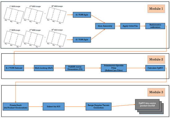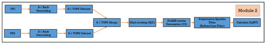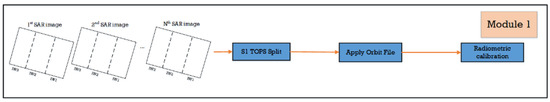For single sub-swath processing (e.g., IW3), Module 1 was modified as shown in Figure 5. Since all studied fields were in one IW3 for track 134, Modules 2 and 3 remained the same as for the first workflow.