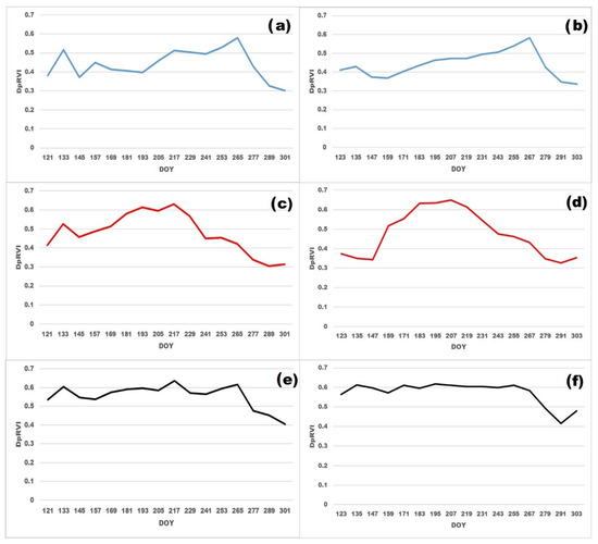 DpRVI seasonal course for: (a) soybean in Khabarovskiy District, (b) soybean in Amur Region, (c) oat in Khabarovskiy District, (d) oat in Amur Region, (e) fallow in Khabarovskiy District, (f) fallow in Amur Region.