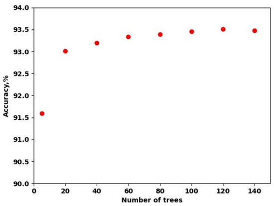 Based on the grid search results, RF hyperparameters were chosen during cross-validation. A Gini function was applied to measure the quality of a split. The minimum number of samples required to split an internal node was 2. The most important parameter influencing cross-validation accuracy was the number of trees. Figure 8 shows the cross-validation accuracy dynamics with the increasing number of trees. Accuracy increased slightly after 20 trees, peaked at 93.5% at 120 trees, and then overfitting was observed. Thus, 120 trees were chosen as the optimal value. Increasing this parameter further does not improve accuracy.