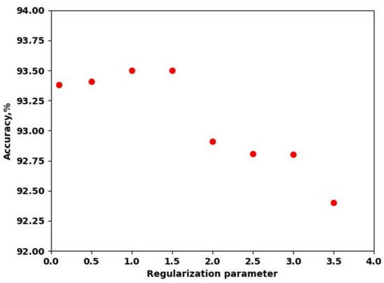 The SVM method also has a set of hyperparameters. A grid search revealed that the balanced class weight insubstantially increased the accuracy. Balanced weight uses the values of y to automatically adjust weights inversely proportional to class frequencies in the input data. L2 norm was used in the penalization, and squared hinge was the loss function. The maximum number of iterations was increased to 10,000. Figure 9 shows the tuning of regularization parameter C. It is a loss term that makes sure that that the weights classify the training data points correctly. The highest cross-validation accuracy (93.5%) was achieved with a standard value (C = 1), which means that changes in this hyperparameter decreased the accuracy.