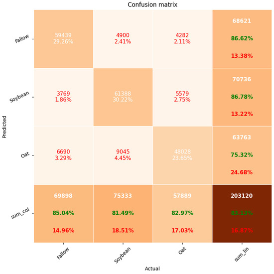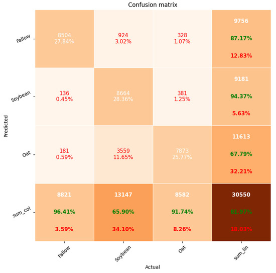 Figure 10 shows the confusion matrix for the RF. The proportion of correctly identified time series was: 94% for fallow, 97% for soybean and 68% for oat. Further, 31% of oat time series were attributed by RF to the fallow class, and among the time series assigned by the classifier to the fallow class, the share of the oat was 27%.