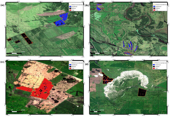 Figure 12 shows examples of crop identification in the fields. Figure 12a shows two soybean and four abandoned fields, located in Arkharinskiy District. Out of 12,413 soybean field pixels, 10,148 (82%) were recognized correctly. Problematic areas in the fields were identified as a fallow. Similarly, 7916 out of 8497 fallow land pixels were identified correctly (93%). The detection of growing crops in individual pixels of agricultural fields may be associated with the germination of crops sown in previous years. Figure 12c shows the example of correct oat detection in two fields (total area was 463 ha) in Ivanovskiy District. RF detected 40,317 oat pixels (94% of total amount). Black sites (fallow land) indicated wetlands. Figure 12d shows an example of correct identification of abandoned land in Ivanovskiy District. RF identified 32,203 out of 36,362 time series (88.6%) as fallow land.