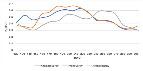 Figure 7a,b show that soybean sowing in the Far East was carried out at the end of May and in the first half of June. However, it can be noted that in the Khabarovskiy District, a grass cover was formed on the fields by the beginning of June. In areas of the Amur Region, as a result of soil treatment with herbicides, the cover was clearly not formed. As soybean grows in the fields, the DpRVI value was also increased. The values of the DpRVI maximum varied insubstantially, from 0.58 for the Oktyabrskiy District to 0.61 for the Ivanovskiy District. The maximum was reached in the second half of September (DOY 259 (16 September) for the Khabarovskiy District and DOY 262–266 (19–23 September) for the districts of the Amur Region). From the end of September onwards, the DpRVI values began to decrease rapidly due to the wilting of plants. At this time, the soybean was ready for harvest, but the exact date of harvest often depends on weather conditions (in rainy seasons, harvest was only done at the beginning of winter).