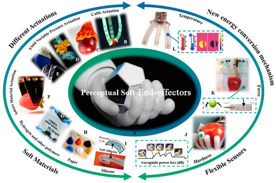 Essential elements of the perceptual soft end-effectors. The combination of soft materials, different actuators, and flexible sensors with a new energy conversion mechanism can achieve a soft end-effector like a human’s hand. (A) Agricultural end-effectors in the future. (B) Cable-driven gripper [28]. (C–E) Grippers driven by variable fluid pressure [29,30,31]. (F) Grippers driven by smart materials [32]. (G–I) Soft materials include hydrogels [33] and other polymers, paper [34], and silicone [31]. (J–L) Soft gripper embedded with a flexible sensor can measure the softness [35], contact force [36], and temperature [37] of fruits and vegetables.