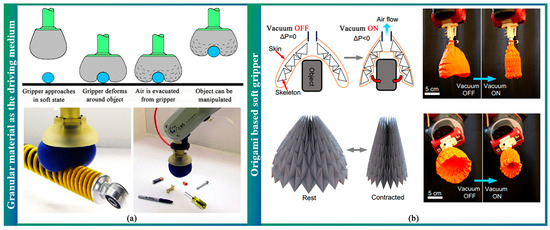 (a) Working principle and application of variable fluid pressure-driven soft end-effector (granular material as the driving medium) [30]. (b) Working principles of the origami “magic-ball” skeleton and a gripper prototype from different perspectives [104].