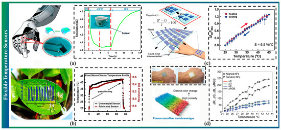 Flexible temperature sensor. (a) An adjustable temperature sensor based on reduced graphene oxide [186]. (b) Compliant wearable temperature sensor for plant growth monitoring [188]. (c) High-sensitivity temperature sensor with thermochromic display [189]. (d) Porous Nanofiber Membrane: Rational Platform for Highly Sensitive Thermochromic Sensor [190].