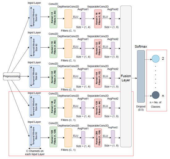 First, 2-D input with temporal (datapoints per sample) and spatial (number of channels) dimensions are transmitted to the input layer for each sample. The model has five branches, and each branch has a 2-D convolutional layers with kernel sizes 8, 16, 32, 64, and 128, and filters with sizes (1, 64), (1, 80), (1, 96), (1, 112), and (1, 128), respectively. By using the convolutional layers in each branch, the model initially learns frequency filters with temporal convolutions.