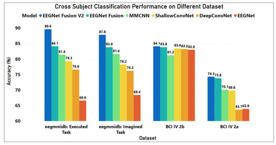 The comparison between the EEGNet Fusion V2 model and the benchmark models based on EEG Motor Movement/Imagery, BCI Competition IV-2a and IV-2b dataset were plotted clearly in Figure 2.