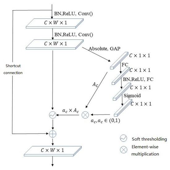 The DRSN shrinkage module is shown in Figure 3. The structure of this module is similar to the channel attention module. The first step is obtaining the absolute value, which is denoted by , of each channel’s feature map. Then, it performs global average pooling on the feature map’s channel dimension. The generated 1-D vector next passes through two fully connected layers and performs a sigmoid process. The output is denoted as . Channel threshold is calculated by . Then, the module performs soft thresholding on each of the feature map’s channels. The denoising is achieved by zeroing unimportant channel features.