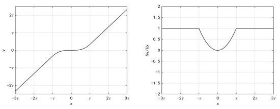 As shown in (3), soft thresholding in each channel directly zeros all features below the threshold, which may eliminate a few useful features other than noise, thereby reducing the signal recognition accuracy [22]. To solve this problem, the soft threshold function is modified. Assuming that the threshold is , the modified threshold function is still an odd function and can be defined as . When , . When , . When , . To ensure that the correction threshold function is continuous at the threshold, . At the same time, to ensure that the correction threshold function is derivable at the threshold, , . According to the above calculations, , , . The final correction threshold function is shown in (3), and the function image is shown in Figure 4. The derivative solved for (3) is shown in (4). Its function image is also shown in Figure 4.