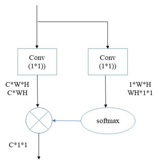 This module first compresses the input feature map with dimension in the channel dimension so as to obtain a single feature map with dimension , which contains the information of all positions in the input feature map to make full use of the global information. The correspondence between each position feature and all other position features in the feature map is calculated by the softmax function to form an attention map. Then, the attention map is multiplied at the element level with the input feature map with dimension , and, finally, all elements in the feature map in each channel are added to obtain the global context relationship with dimension . The last two steps are changed to the matrix multiplication of and in order to simplify the calculation. The calculation is shown in (5), where x represents the input and represents the linear change matrix.