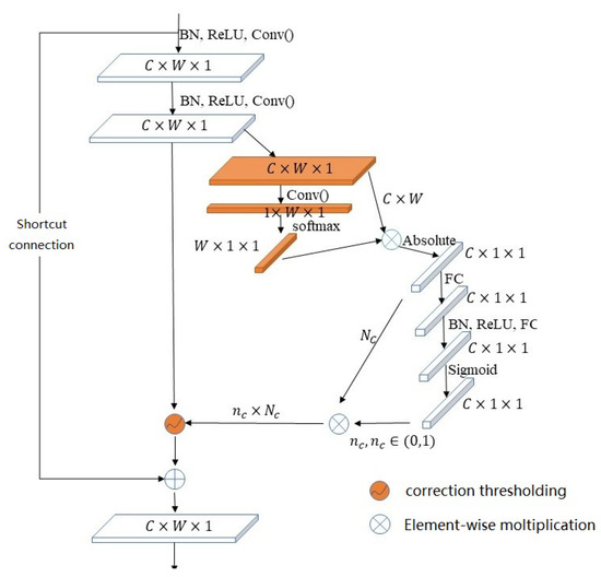 A soft threshold is widely used in the field of traditional signal denoising, such as wavelet denoising. Wavelet denosing mainly consists of three steps: wavelet decomposition, soft thresholding and wavelet reconstruction. Wavelet decomposition involves transforming the original signal into a decomposable scale. Under this scale, coefficients close to 0 are considered unimportant and may be seen as noise. Soft thresholding is used to compress this signal to 0. Its formula is shown in (1), where x represents the input feature and represents the threshold.