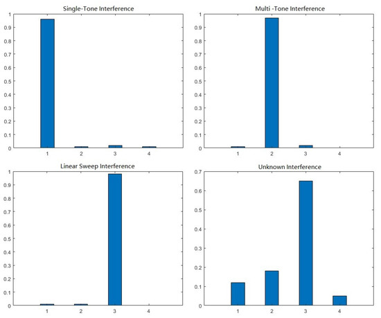 In the −8 dB JNR situation, Figure 7 shows the softmax output from SNRSN, which takes three known interference signals and one unknown interference signal as input. Moving through the SNRSN, even the unknown interference signal can obtain a relatively high-confidence prediction and be classified as one of the known signals. This error information will lead UAVs to make wrong anti-interference decisions, and unknown data cannot be recorded for post-processing.