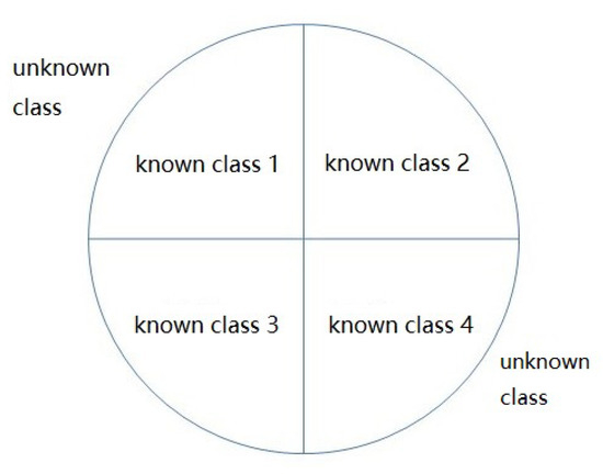 In the training process, only training samples of known class signals can be accessed, so the problem is converted into a one-class classification problem, which means that a hypersphere is trained in the training phase to contain all training samples. Meanwhile, in the testing phase, the samples inside the hypersphere are recognized as known classes, and the outside samples are marked as unknown classes. The simulation of the samples’ distribution in the hypersphere is shown in Figure 8.