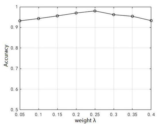 As mentioned in Section 2.1.3, the center loss function and cross-entropy loss function are introduced to construct a joint loss function. The weight of the center loss function in (12) needs to be determined in an experiment. Through multiple tests, the network recognition accuracy is the highest when the weight is 0.25, as shown in Figure 10. Thus, it is set to 0.25 in the following experiments.