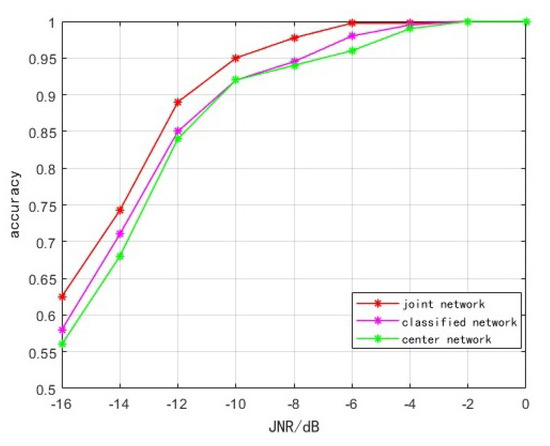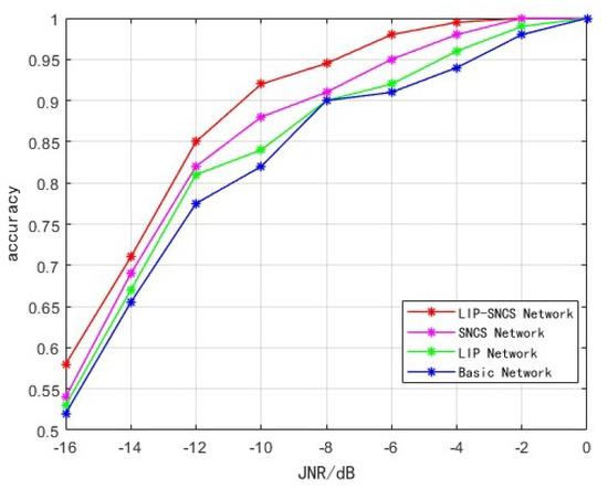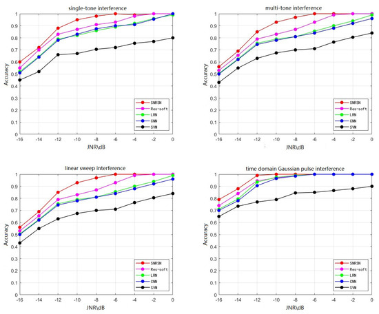 It can be seen from Figure 14 that the recognition accuracy of the four methods improves with the increase in the JNR during the test, indicating that the decrease in noise content makes it easier to extract the features of the interference signal.