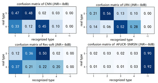 The proposed SNRSN executes a denoising process during feature extraction. Compared with Res-soft, its recognition accuracy increases by approximately 2–10% in the JNR range of −16 to −6 dB. This proves that SNRSN focuses more on useful features in the signal and suppresses noise to make the network perform more stably. SNRSN has robustness and noise immunity. Each model’s recognition accuracy on each type of interference is shown in Table 3. It proves that the proposed model has better performance comprehensively.