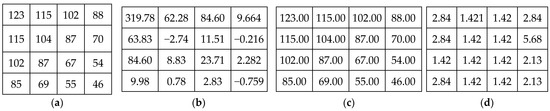 (a) Input block, (b) Krawtchouk transform, (c) reconstructed block, (d) absolute difference between the input block and the reconstructed block, factored by 10−14.