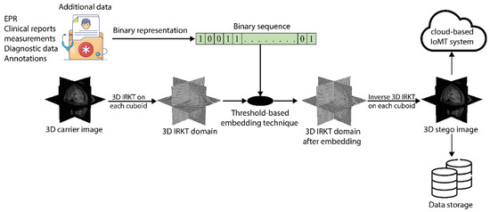 Consider a 3D medical image with N × N × N voxels. The additional data are embedded into the carrier image f, as depicted in Figure 3, through a series of steps, which are outlined below: