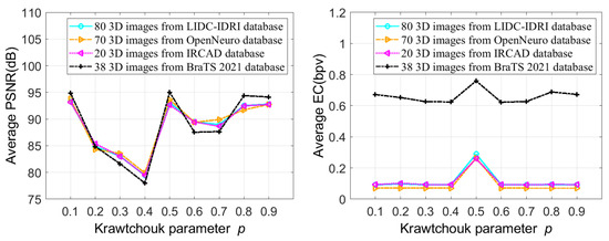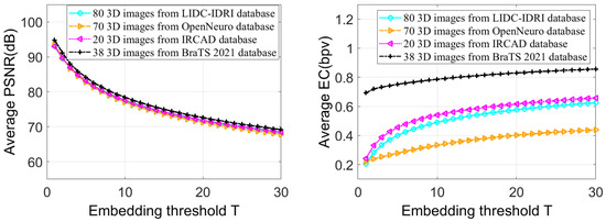 The fifth conducted test shows that the performance of the IRKT-based 3D RDH is improved by the cuboid size used when calculating IRKT. Figure 7 compares the PSNR and EC values of four medical databases, using cuboids of size 2 × 2 × 2, 4 × 4 × 4, and 8 × 8 × 8, with thresholds ranging from T = 1 to T = 30. From this figure, it is observed that the cuboid of size 4 × 4 × 4 offers better embedding capacity for all thresholds, followed by the cuboid of size 8 × 8 × 8 due to their more concentrated IRKT histograms in the interval [−T, T) and the presence of significantly higher peaks in this interval. On the other hand, the cuboid of size 2 × 2 × 2 shows a low embedding capacity for all thresholds due to its less-concentrated IRKT histogram in the interval [−T, T).