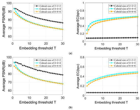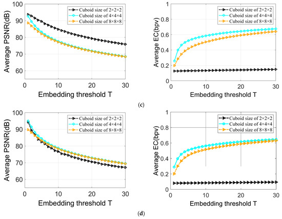 In terms of 3D stego image quality, the cuboid of size 4 × 4 × 4 offers a relatively high PSNR compared with the cuboid of size 8 × 8 × 8, especially for lower thresholds, while maintaining a comparable PSNR for higher thresholds. In contrast, the cuboid of size 2 × 2 × 2 has the highest PSNR due to its more limited embedding capacity. Overall, the cuboid of size 4 × 4 × 4 offers the maximum embedding capacity and a satisfactory PSNR for all thresholds.