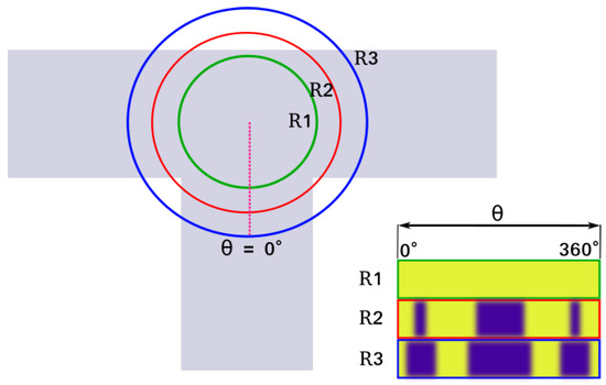 The result of this calculation for a given radius for two different positions on the road is shown in Figure 2. Repeating this operation for multiple radii, multiple rows can be generated, and the road descriptor for the point p can be computed as shown in Figure 3. In our framework, such road descriptors are precomputed for each node on OpenStreetMap and stored in a lookup table for the initialization step.