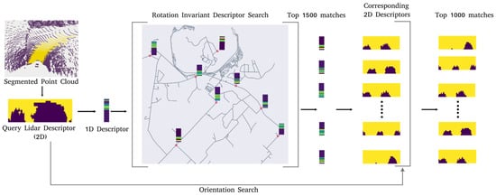 For the simulation process, instead of using real-world point clouds with road labels, as explained in Section 3, we generate a virtual BEV image from OpenStreetMap. This image is simply a top–down snapshot of the portion of the map around the true pose . The virtual BEV image is used to generate the LiDAR descriptor L as explained in Section 3.1. The LiDAR descriptor is then used as the query descriptor for the road descriptor search process.