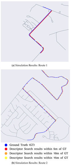 From the simulation results, it can be seen that the descriptor search technique is most effective in segments of the route where there are road features such as turns and intersections, whereas it struggles in segments with only straight roads. This is prominent in the results from Route 2 (Figure 7b), where localization is lost in the straight portions of the route but subsequently regained at the portions with intersections and turns.
