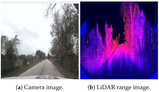 To detect the road surface, a range image-based segmentation method based on RangeNet++ [16] is used. The model is trained on the Texas A&M Autonomous Vehicle rural road dataset [17]. The dataset contains 2800 range images (illustrated in Figure 9) labeled for the detection of road points. It also includes vehicle bus data, such as GPS, IMU, steering, brake, throttle inputs and wheel speed measurements. In all, the dataset contains around 15 min of driving data.
