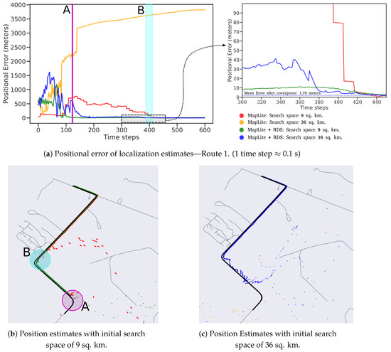 When RDS initialization is used, a distinct reduction in time to convergence is observed both for the 9 and 36 sq. km search spaces. Referring to Figure 10b, for the 9 sq. km search test, the MapLite algorithm converges only after it sees road features up to turn B, which is indicated by the drop in error after around 400 time steps. In comparison, when RDS initialization is used, the algorithm quickly converges after around 100 time steps, when the vehicle reaches the turn ‘A’, and is therefore much faster than the earlier case.