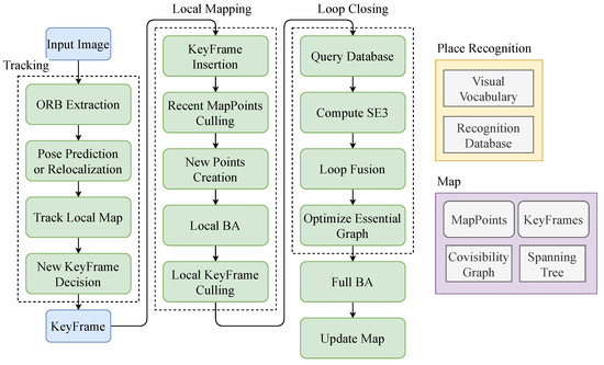 The system consists of three threads: tracking, local mapping, and loop closing. In this paper, we use the stereo implementation of ORB-SLAM2. The tracking thread tracks the camera pose and creates new keyframes when necessary. The local mapping thread creates new map points, performs local bundle adjustment, and removes redundant keyframes and map points. The loop closing thread detects loops using bag-of-words (BoW) and performs global bundle adjustment. The framework of ORB-SLAM2 is illustrated in Figure 1.