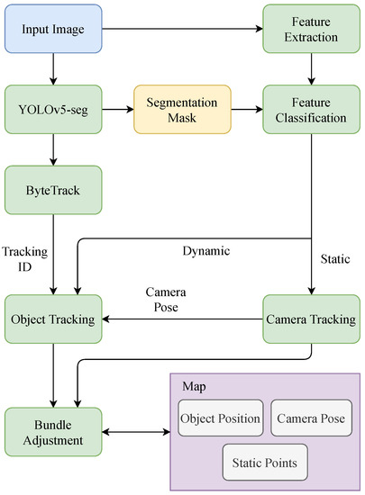 In Figure 2, we can see that, compared with ORB-SLAM2, there are some new modules added to the system: a YOLOv5-seg detection and segmentation module, a ByteTrack tracking module, a feature classification module, and an object position estimation module. And, the bundle adjustment module has been modified to optimize the positions of dynamic objects as well. In this chapter, we will introduce these modules in detail.