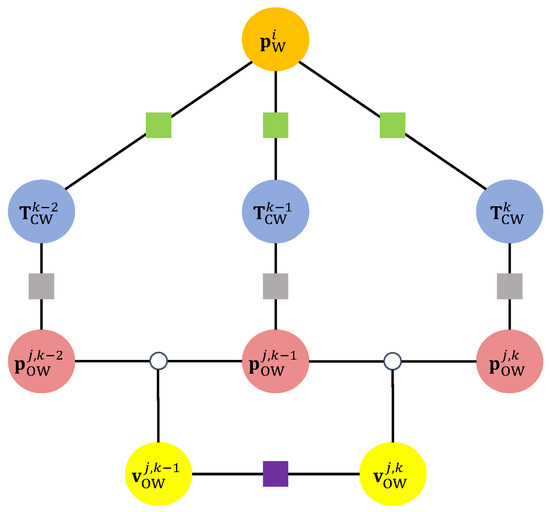 ORB-SLAM2 performs local bundle adjustment to optimize the camera pose and static map points. In our method, we extend local bundle adjustment to optimize the camera pose, static map points, and dynamic object positions. The factor graph of the bundle adjustment problem is shown in Figure 6. We minimize the re-projection error of static points to optimize the camera pose and static map points. We also define a re-projection error term for dynamic objects to optimize the camera pose and dynamic object positions. Additionally, we define a motion smoothness regularization term to regularize the motion of dynamic objects.