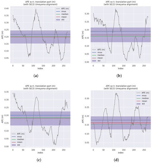 The APE comparison of ORB-SLAM2 and OTE-SLAM on Sequence 04. (a) ORB-SLAM2. (b) ORB-SLAM2 with masks. (c) DynaSLAM. (d) OTE-SLAM.