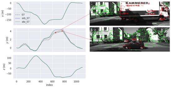 Figure 8 shows the APE comparison of ORB-SLAM2 and OTE-SLAM on Sequence 07 in the x, y, and z directions. From the 500th frame to the 800th frame, OTE-SLAM has performance which is obviously better than ORB-SLAM2 in the y direction. Two frames in this period are shown in the Figure. We can see that the car holding the camera is waiting at the crossroad. While it is waiting, some trucks and cars are passing by. These moving vehicles have a significant impact on the estimation of the camera pose for ORB-SLAM2. Meanwhile, OTE-SLAM does not suffer from this problem because it tracks the camera only with the features in the background and has the object moving information as additional constraints.