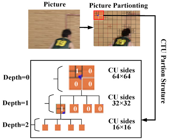 In HEVC, all the CUs of the CTU are traversed based on the quad-tree technique and the RD costs of all CUs are compared for determining the final CU partition. The quad-tree technique is shown in Figure 2, where 0 and 1 mean not splitting and splitting, respectively. The encoding process usually splits the complex texture region into smaller CU after multiple, thus determining the best CU partition structure. In contrast, for the smooth texture regions, only one intra-frame pattern is needed to accurately predict the pixel of the current CTU, and no split into smaller CU is required. This indicates that we can terminate the CU partition of the smooth regions in advance by judging the image texture, which can reduce the coding time by a significant amount.