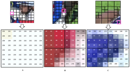 To measure the CU texture complexity, three different 8 × 8 blocks of pixels from the sequence Race Horses are selected for observation. Considering that the luminance component represents the brightness or intensity information of the image, which is more helpful in perceiving the edge and texture features of the image, the pixel values here are the luminance pixel values, as shown in Figure 3. It can be seen that for block A the pixel values distribution are relatively uniform and the pixel values do not differ significantly. While for areas similar to blocks B and C, the pixel values fluctuate greatly and are not evenly distributed. Therefore, we determine the texture of a CU based on decisions on both global and local metrics.