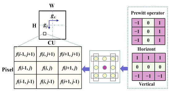 The texture information can be obtained by comparing the gradients in different directions. The most common ones are the horizontal and vertical edge information. Prewitt operator [32] can sensitively capture both vertical and horizontal edge information of a pixel. Therefore, these two directional gradient operators are used to calculate the gradient amplitude of the CU and measure the local texture of the CU, as shown in Figure 4. The amplitude of the directional gradient represents the pixel difference between the adjacent pixels along this direction. The closer the difference is to zero, the smoother the region is in this direction. If the gradient difference between the adjacent blocks is large enough, it indicates that they belong to different texture features and need to be divided into smaller CU.