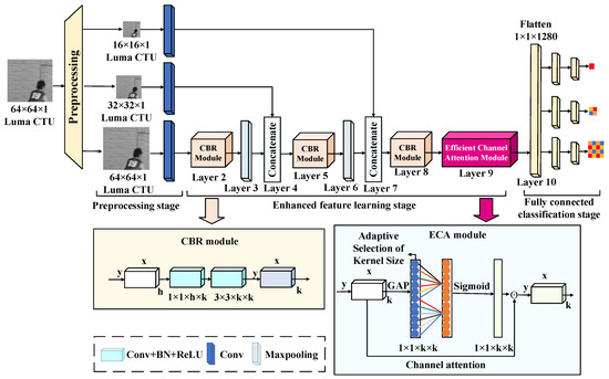 Finally, in order to be able to fully learn the details of CU features of four different sizes, the CU data of the three different down-sampling outputs from the preprocessing stage are added after each maximum pooling layer, thus improving the training efficiency of the network. Note, that due to the different feature map sizes, a separate non-overlapping convolution operation is performed on the down-sampling data to enable concatenation at the end. In addition, a lightweight efficient channel attention (ECA) model [34] is introduced to compensate for the problem of ignoring critical information between network channels in the convolution operation. The ECA model avoids the dimensionality reduction allows for efficient learning of channel information and thus improves accuracy. Without compromising training time, this module is introduced after the output of the convolution operation to ensure performance stability.