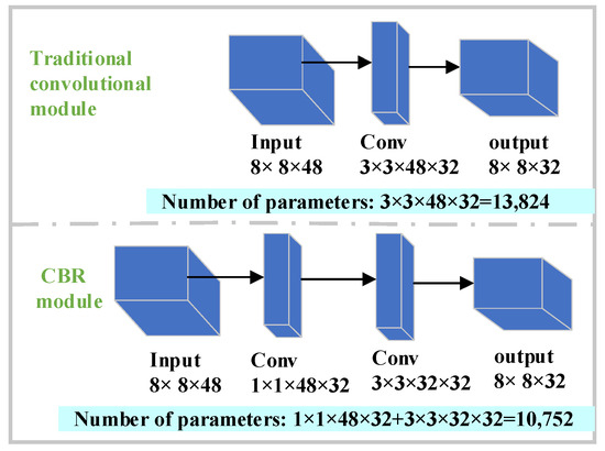 More specifically, the main structure of the CBR module in this paper is designed as 1 × 1 + 3 × 3 (Conv, BN, and ReLU). First, a 1 × 1 convolution is used to reduce the number of channels as well as realize the channel information interaction, thus avoiding the unlimited increase in the number of channels caused by concatenating the convolution channels in the enhancement feature learning stage. Secondly, the 3 × 3 convolution can reduce the amount of parameter computation compared to other large-size convolutions and enhance the generalization ability and training efficiency of the CNN. It is used after the 1 × 1 convolution to extract the useful features. Furthermore, to explore the computational complexity of the CBR model, Comparing the number of parameters transmitted in the fourth layer of the proposed CNN between the CBR model and the conventional convolutional model is shown in Figure 6. It can clearly be seen that the CBR model has fewer parameters and lower computational costs compared to the traditional convolutional module. This is designed to maintain high performance in extracting the CU features while improving the efficiency and reducing the complexity of the overall model.