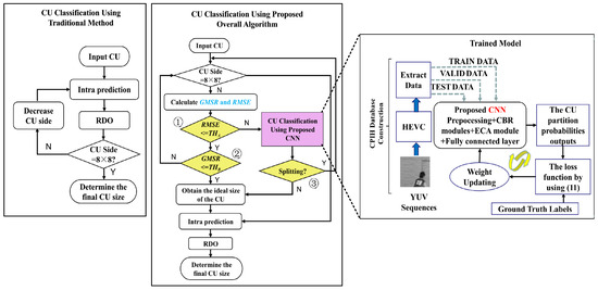 An algorithm is proposed based on the CNN combined with CU-based texture discrimination to make full use of texture information. The fast algorithm not only uses the advantages of the heuristic algorithm to skip the unnecessary CU partition in advance but also replaces the complex process of traversal searching RDO in the traditional algorithm based on the advantages of CNN. The general flow of the fast algorithm and the traditional method is shown in Figure 7. Firstly, the collected data is input into the designed network for training. Then, the network is trained cooperatively according to the target loss function. Finally, the trained model is embedded into HEVC, so as to replace the original traversal search process. The proposed algorithm needs to go through three layers of metrics corresponding to global judgment RMSE, local judgment GMSE and prediction judgment of CNN respectively. Specifically, Before starting to partition the CU, the size of the CU needs to be judged in advance. Except for the 8 × 8 CU, the rest of the CUs first calculate the texture complexity by the metrics GMSR and RMSE. The global texture complexity of the CU is first measured using RMSE. Measures the complexity of the local texture if . If , the CU is considered smooth and no smaller size partition on decision is made. Otherwise, a CNN is used to determine whether it requires further partition. The fast CU partition algorithm can evaluate the current CU texture complexity and select the best CU partition by three layers of metrics.