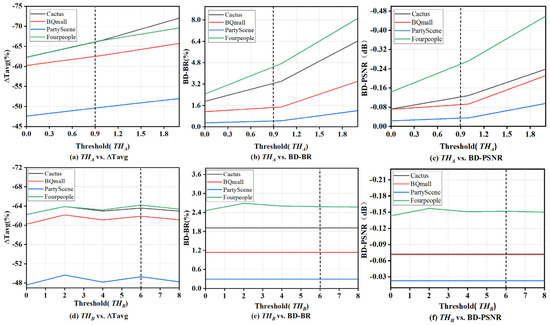 As known in Section 2.4, the threshold directly affects the judgment of texture complexity and subsequent RD performance. To find a suitable threshold that can balance well the computational complexity and RD performance, the threshold experiments are conducted by pre-assignment method. Specifically, to ensure the generality and accuracy of the results, the BQ Mall, Cactus, Party Scene, and Four People sequences with different features and different resolutions are selected for the test. The curves, BD-BR curves, and BD-PSNR curves varying with the threshold are obtained, as shown in Figure 8. From Figure 8a–c, it can be seen that the increases steadily with the threshold, the BD-BR and the BD-PSNR change relatively stable when the less than 1 while changing steeply when the is greater than 1. This is due to that as a global threshold, any small changes of will lead to fluctuations in encoding performance and complexity since the features of the entire image are relatively stable. In addition, when the threshold exceeds a certain value, the performance will change significantly. Considering that the threshold greater than 1 may cause a significant change in the bit rate and PSNR, from Figure 8a–c, it can be seen that it is reasonable to choose equal to 0.9 as the threshold. Figure 8d–f shows the vs. BD-BR and vs. BD-PSNR curves varying with the threshold , respectively, based on the suitable threshold equal to 0.9. It is clear that the fluctuation of the vs. BD-BR and vs. BD-PSNR curves with is very small. This is due to that the global metric already takes into account a large number of texture features, leading to a small variation in texture differentiation with local metric thresholds. However, the local metrics can avoid some redundant RD calculations due to their simplicity, thereby reducing time. It can be seen that the encoding time is shortest when equals to 2 and 6, while the changes of BD-BR and BD-PSNR are smoother when equals 6. Therefore, the equal to 6 is empirically chosen as the suitable threshold.
