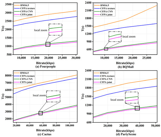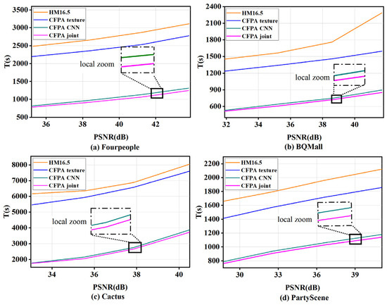 For convenience, the proposed texture classification decision, the CNN and the total algorithm are denoted by , , and , respectively. The original encoder method is denoted as HM16.5. To compare the performance of the above algorithms, this section selected test sequences with different resolutions such as BQ Mall, Cactus, Party Scene, and Four People for encoding testing with QP values {22, 27, 32, 37}, respectively. Figure 9 and Figure 10 show the variation curves of bit rate, PSNR and coding time, respectively. It is confirmed that the , , and algorithms can significantly reduce the coding time compared to the original algorithm. In Figure 9 and Figure 10, localized enlarged views of and are shown. Obviously, the proposed has the least coding time. This advantage is attributed to that the algorithm can avoid the CU partition of the smooth regions and further use the proposed CNN method to predict CU partition of the complex texture regions, consequently effectively reducing many redundant calculations and reducing the coding complexity.