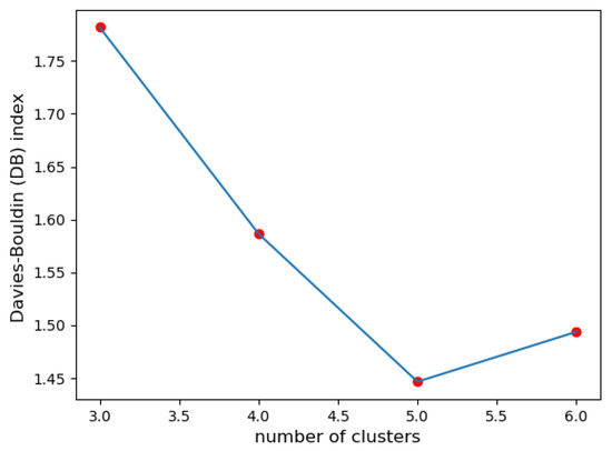 III. Davies–Bouldin index: Upon evaluating the quality of the clustering solutions with different cluster numbers (3, 4, 5, and 6), the index for the solution with 5 clusters was the lowest compared to the other configurations (see Figure 3). This suggests that clustering with 5 clusters leads to better separation and compactness of clusters.