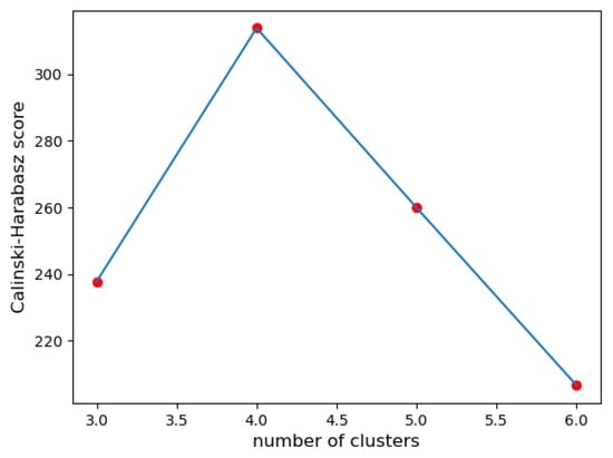 IV. Calinski–Harabasz index (CH): When evaluating the CH index, the configuration with 4 clusters is the best compared to the others. It has the highest value in comparison to the other configurations (see Figure 4). Certainly, a higher CH index value means that the clusters are dense and well-separated. However, there is no ‘acceptable’ cut-off value, and we need to choose the solution that provides a peak or at least an abrupt elbow on the line plot of CH indices.